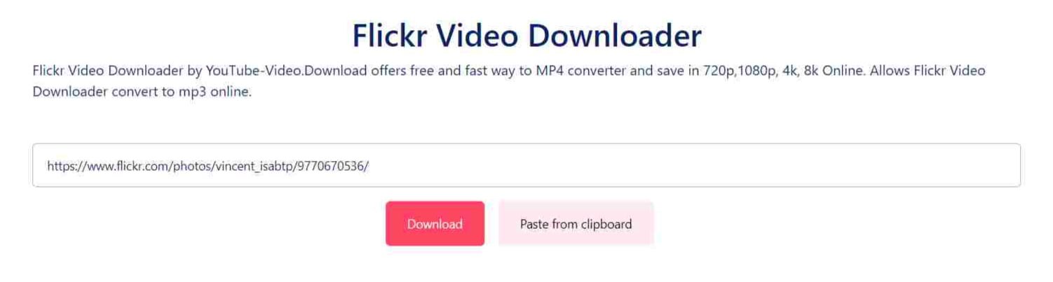 Mit dem kostenlosen Video-Download können Sie Flickr-Videos online herunterladen. Lädt Flickr-Videos schnell herunter. Es gibt keine Registrierung oder Kosten. Geben Sie eine Video-URL zum Herunterladen ohne Pop-ups ein.