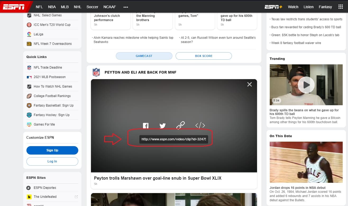 Adım 1: Paylaş düğmesini tıklayın -> Videoyu içeren ESPN video URL’sini kopyala’yı seçin.
