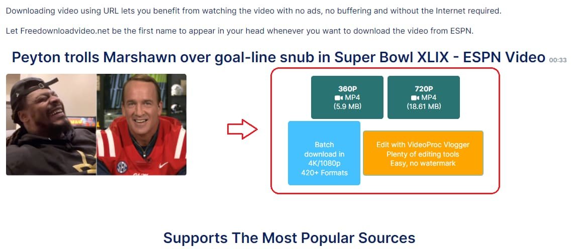 Freedownloadvideo.net, ESPN videolarını indirmek için idealdir. Freedownloadvideo.net, kullanıcıların NBA playoffları gibi ESPN veya YouTube ESPN Kanalı spor videolarını hızlı bir şekilde indirmelerine olanak tanır (orijinal ESPN video boyutuna bağlı olarak, genellikle 5 dakikalık bir videonun yalnızca 30 saniyeden kısa bir süreye ihtiyacı vardır).